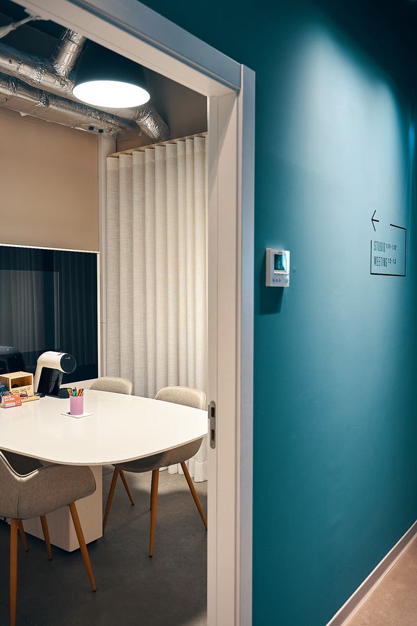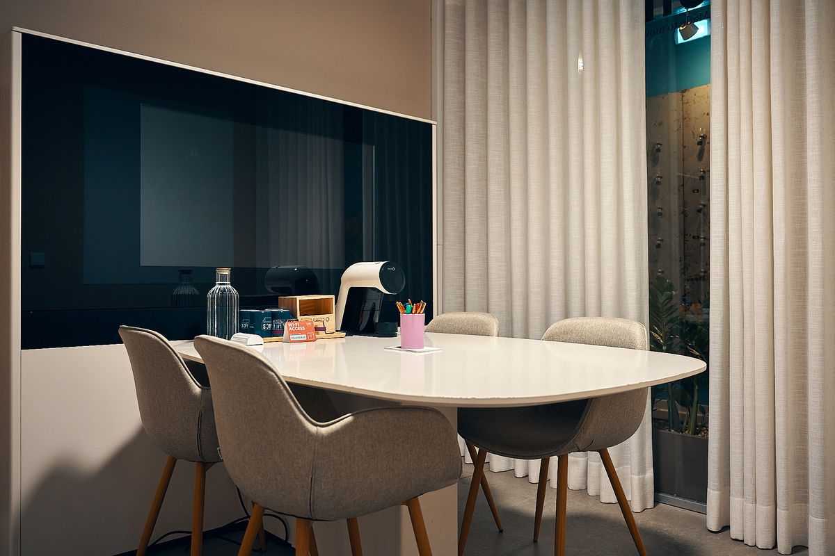 Sala de reunião com capacidade até 4 pessoas em mesa única, equipada com écra para projetar. O valor de aluguer da sala inclui um white board, coffee station com uma máquina de café expresso, cápsulas e água mineral.